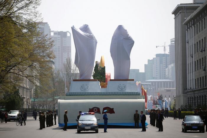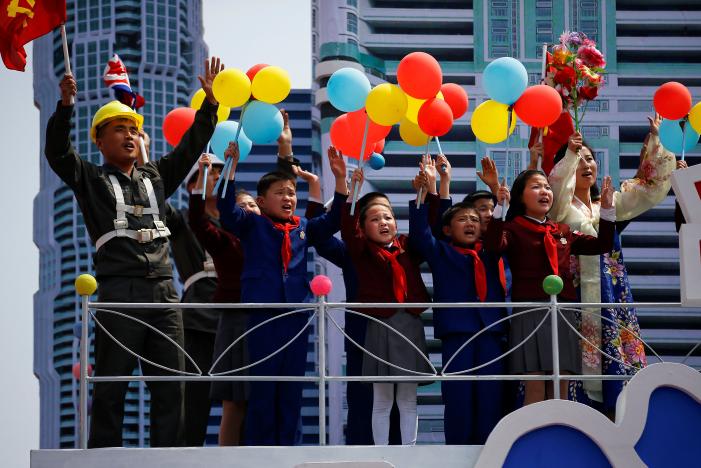 - People react as they march past foreign journalists and the stand with North Korean leader Kim Jong Un during a military parade marking the 105th birth anniversary of the country’s founding father Kim Il Sung, in Pyongyang, April 15, 2017. REUTERS/Damir Sagolj