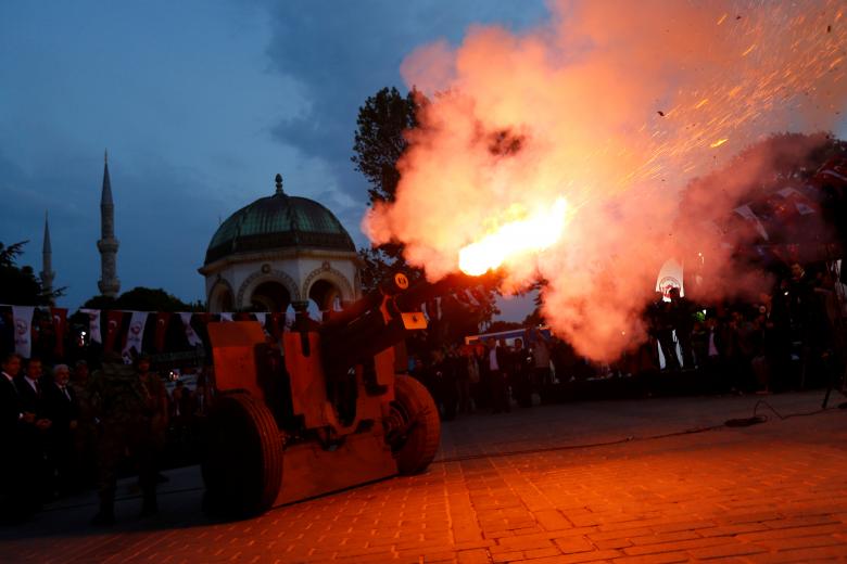 A cannon fires a ceremonial shot to start iftar, the evening meal for breaking fast at Sultanahmet Square in Istanbul, Turkey, May 27, 2017. REUTERS/Murad Sezer