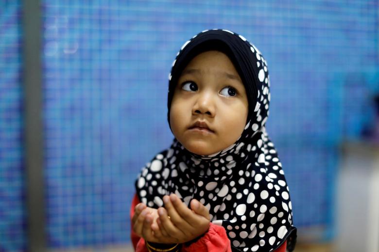 A girls prays while people prepare to break the fast on the first day of Ramadan in a mosque in Bangkok, Thailand May 27, 2017. REUTERS/Jorge Silva