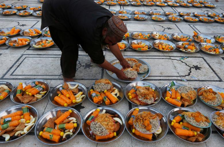 A man arranges food plates for people to break fast at a mosque in Karachi, Pakistan May 28, 2017. REUTERS/Akhtar Soomro