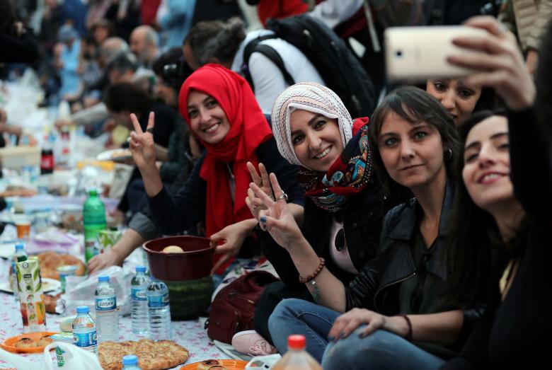 People pose for a selfie as they break their fast at the main shopping and pedestrian street of Istiklal in central Istanbul, Turkey, May 27, 2017. REUTERS/Huseyin Aldemir