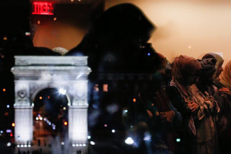 Washington Square Arch is seen on the left as Muslim women praying Tarawih prayers are reflected in the window of the Islamic Center at New York University ahead of Ramadan in Manhattan, New York, May 26, 2017. REUTERS/Gabriela Bhaskar