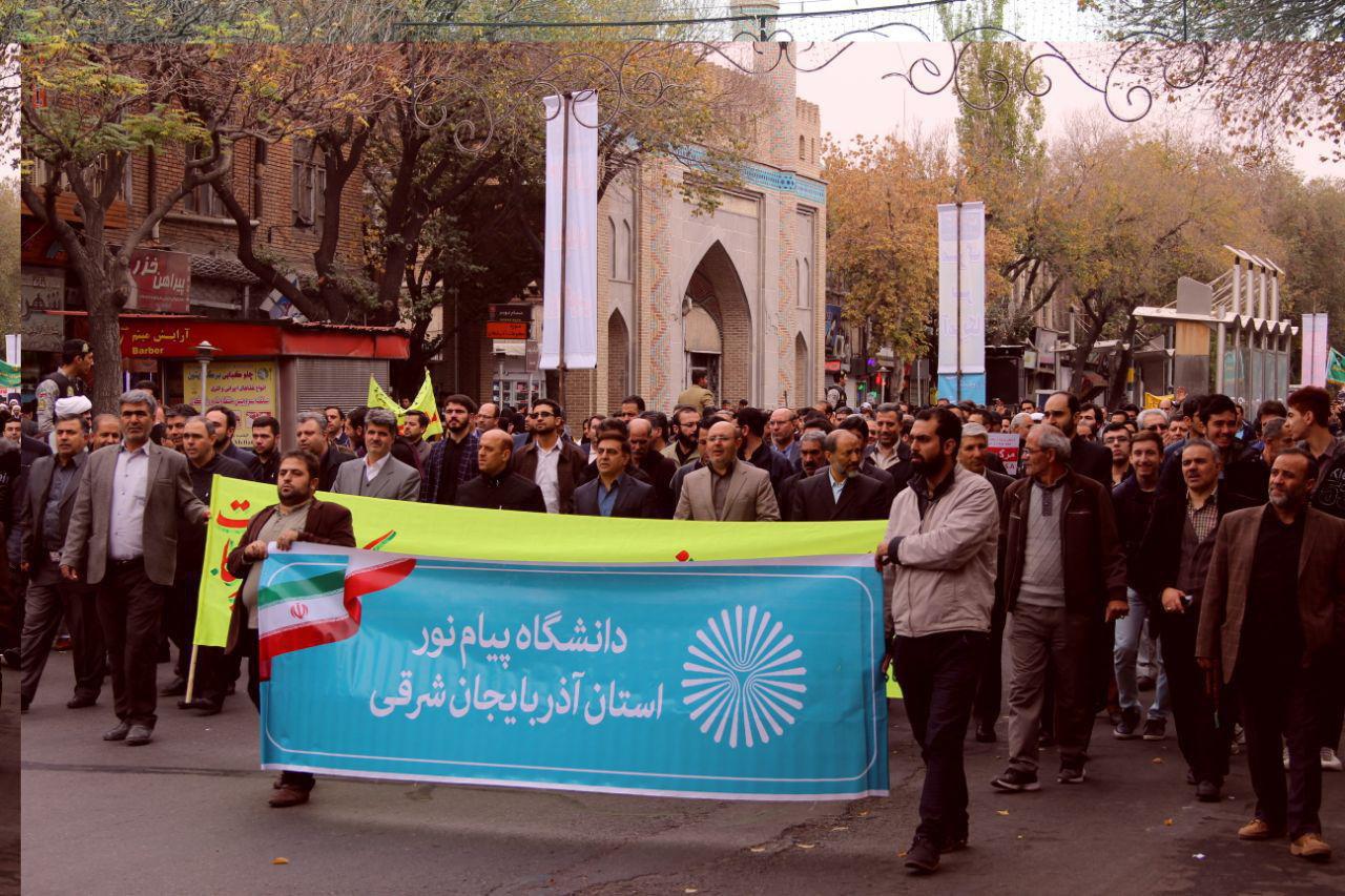 به گزارش خبرگزاری یوپنا، استادان، کارکنان، مسئولان و دانشجویان دانشگاه پیام نور کشور همگام و همراه با دیگر اقشار مردم انقلابی ایران به مناسبت یوم الله ۱۳آبان با تجمع در راهپیمایی این روز تاریخی و بزرگ را گرامی داشتند.