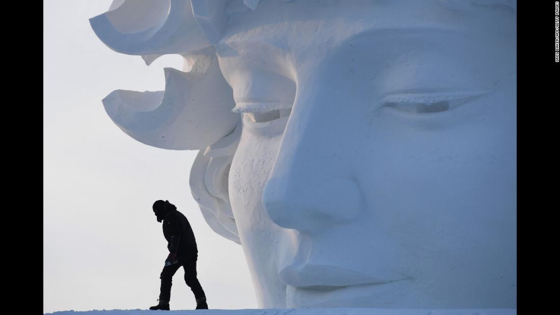 - TOPSHOT – A worker walks past a snow sculpture before the opening of the annual Harbin Ice and Snow Sculpture Festival in Harbin in China’s northeast Heilongjiang province on January 5, 2018. The festival attracts hundreds of thousands of visitors annually. / AFP PHOTO / Greg Baker (Photo credit should read GREG BAKER/AFP/Getty Images)