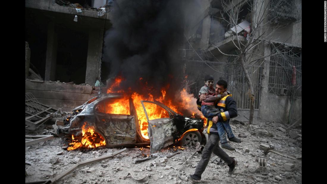- A Syria Civil Defence member carries a wounded child in the besieged town of Hamoria, Eastern Ghouta, in Damascus, Syria Janauary 6, 2018. REUTERS/ Bassam Khabieh TPX IMAGES OF THE DAY (Newscom TagID: rtrlnine448022.jpg) [Photo via Newscom]