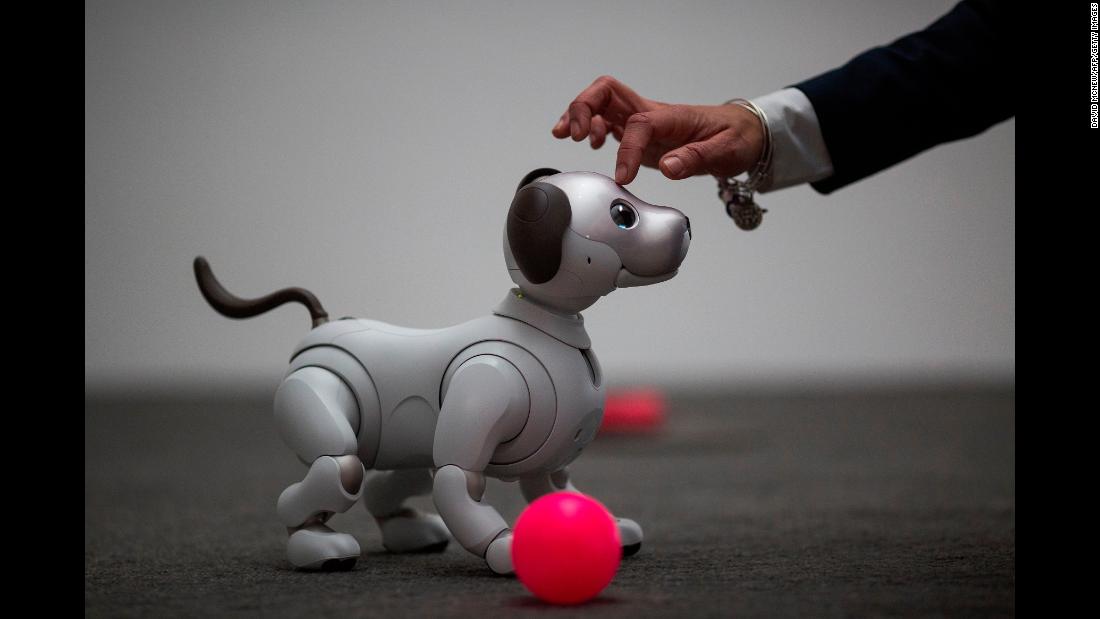 - TOPSHOT – The newest generation of the Aibo robot, which uses artificial intelligences, is demonstrated on the eve of CES in Las Vegas, Nevada, January 8, 2018. / AFP PHOTO / DAVID MCNEW (Photo credit should read DAVID MCNEW/AFP/Getty Images)