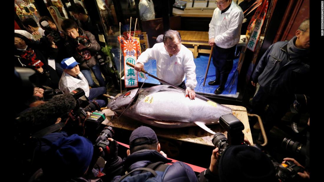 - Kiyomura Co’s President Kiyoshi Kimura (C), who runs a chain of sushi restaurants Sushi Zanmai, poses with a 190 kg bluefin tuna, priced with a 30.4 million yen bid at the fish market’s first tuna auction this year at his sushi restaurant outside Tsukiji fish market in Tokyo, Japan, January 5, 2018. REUTERS/Toru Hanai TPX IMAGES OF THE DAY (Newscom TagID: rtrlnine442802.jpg) [Photo via Newscom]