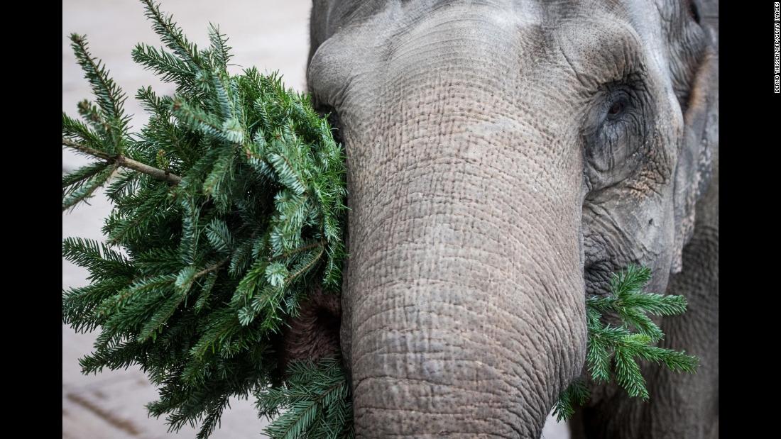 - TOPSHOT – Female elephant Rada plays with a Christmas tree at the Allwetterzoo zoo in Muenster, western Germany, on January 5, 2018. / AFP PHOTO / dpa / Bernd Thissen / Germany OUT (Photo credit should read BERND THISSEN/AFP/Getty Images)