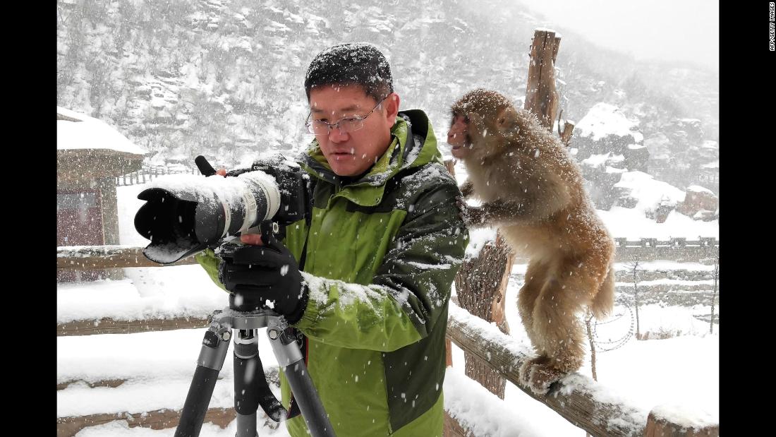 - This picture taken on January 6, 2018 shows a macaque monkey looking at a man’s camera during snowfall at Wulongkou Nature Reserve in Jiyuan in China’s central Henan province. / AFP PHOTO / – / China OUT (Photo credit should read -/AFP/Getty Images)