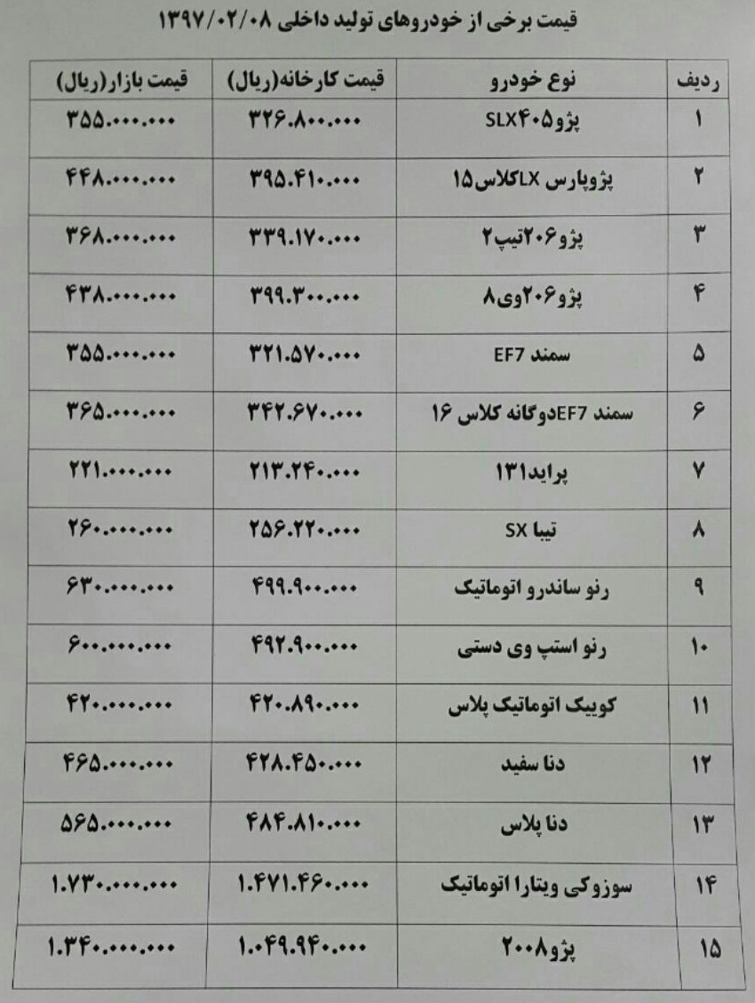 همچنین ساندرو استپ وی اتوماتیک هم با افزایش ۳ میلیون تومانی با قیمت ۷۱ میلیون تومان، پژو ۲۰۶ صندوق دار با افزایش ۲ میلیون و ۵۰۰ هزار تومانی با قیمت ۴۳ میلیون و ۸۰۰ هزار تومان، پژو ۴۰۵ اس ال ایکس با افزایش ۱ میلیون و ۵۰۰ هزار تومانی با قیمت ۳۵ میلیون تومان، تندر پلاس با افزایش یک میلیون و ۲۰۰ هزار تومانی با قیمت ۶۰ میلیون و ۲۰۰ هزار تومان مورد معامله قرار می گیرد.