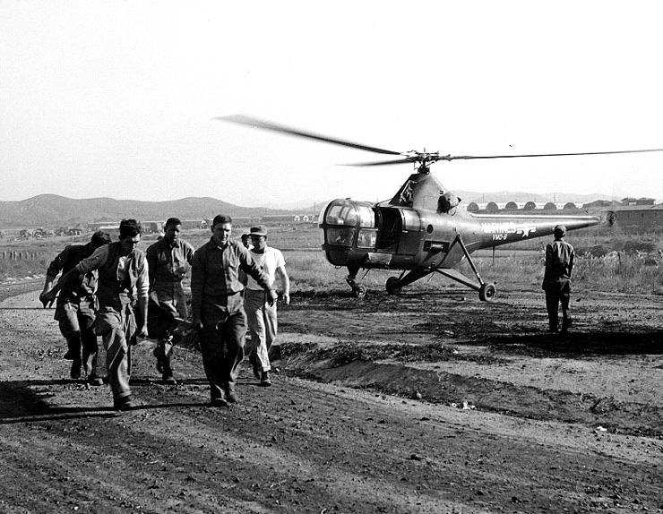 - U.S. Navy Corpsmen help carry a wounded soldier from a Marine Corps helicopter in the vicinity of Seoul, October 3, 1950. REUTERS/Official U.S. Marine Corps Photograph via National Archives
