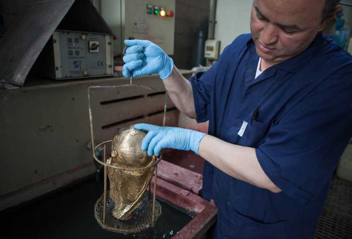 - FIFA World Cup a rise to history At the end of the gilding bath, the cup is carefully washed in distilled water. Paderno Dugnano, Italy. May 2018. © Paolo Vezzoli