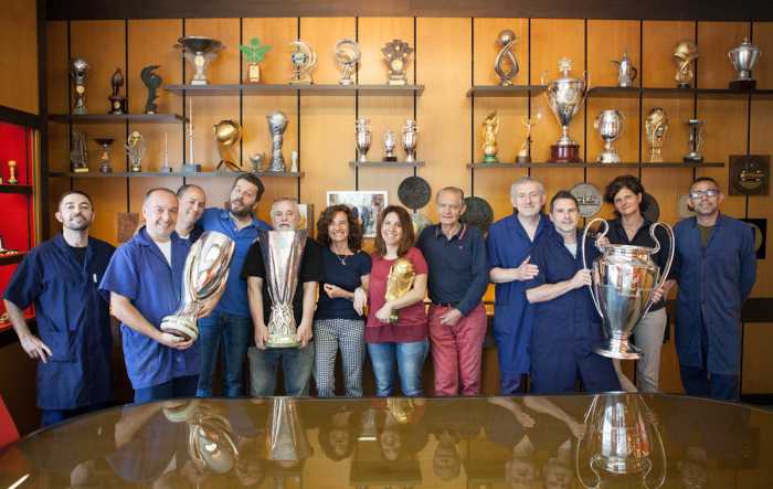 - FIFA World Cup a rise to history The staff of GDE Bertoni in its entirety posing for a group photo with the most famous cups historically produced by the company: UEFA Supercup, UEFA Europa League, FIFA World Cup and UEFA Champions League. Paderno Dugnano, Italy. May 2018. © Paolo Vezzoli