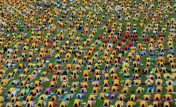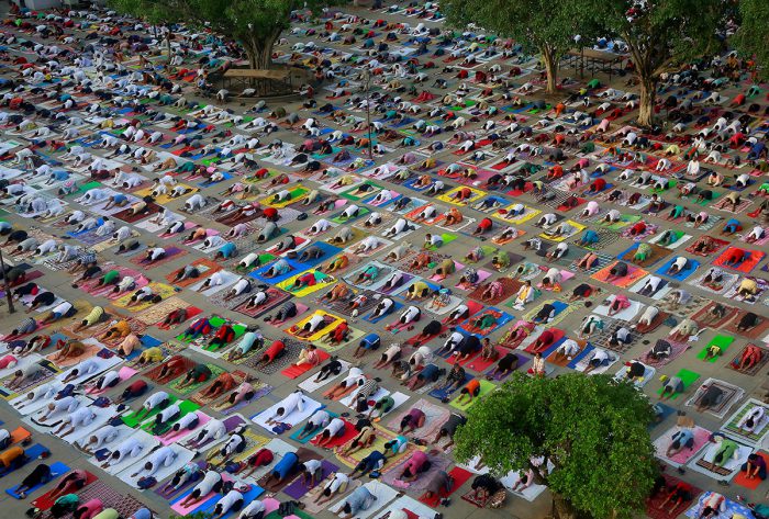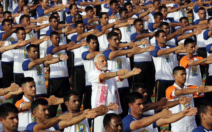 - Indian Prime Minister Narendra Modi, center, performs yoga along with thousands of Indians to mark International Day of Yoga in Dehradun, India, Thursday, June 21, 2018. Millions of yoga enthusiasts across the world took part in mass yoga to observe International Yoga Day. (AP Photo/Manish Swarup)