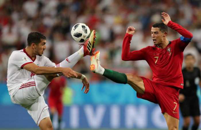 - Iran’s Majid Hosseini in action with Portugal’s Cristiano Ronaldo. REUTERS/Ivan Alvarado