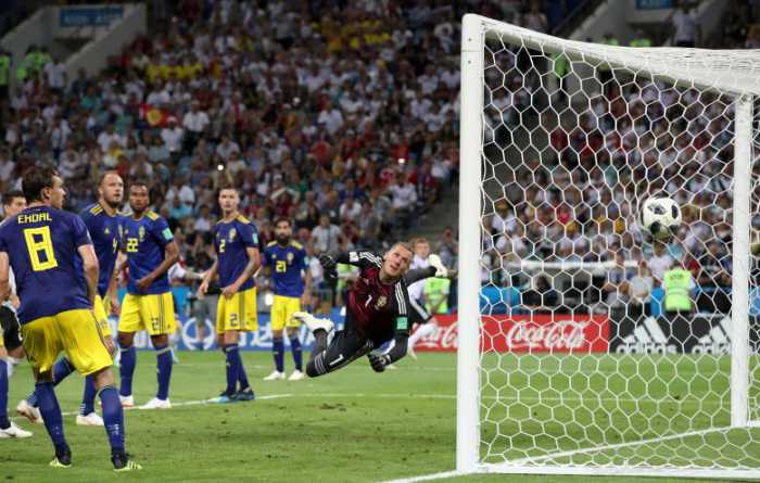 - Germany’s Toni Kroos scores their second goal past Sweden’s Robin Olsen on a free kick. REUTERS/Francois Lenoir