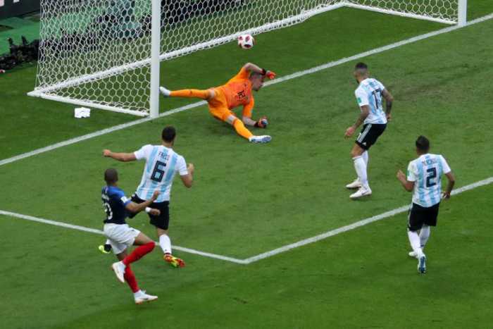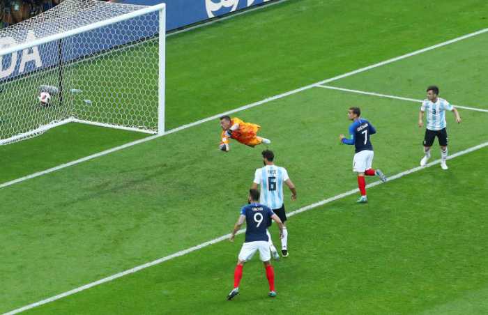 - France’s Benjamin Pavard scores their second goal past Argentina’s Franco Armani. REUTERS/Pilar Olivares