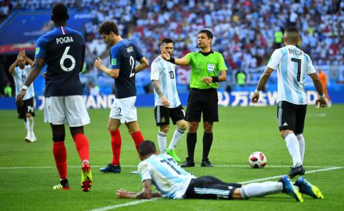 - Argentina’s Nicolas Otamendi and France’s Olivier Giroud both react after going down. REUTERS/Pilar Olivares