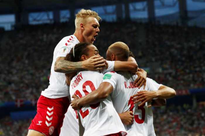 - Denmark’s Mathias Jorgensen celebrates with team mates after scoring their first goal. REUTERS/Damir Sagolj