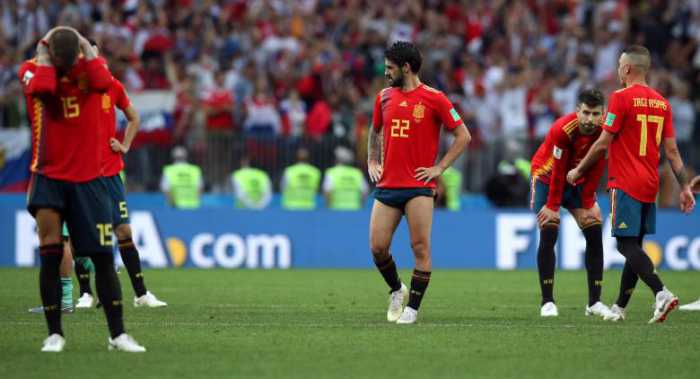 - Spain’s Sergio Ramos, Isco and team mates after losing the penalty shootout. REUTERS/Albert Gea