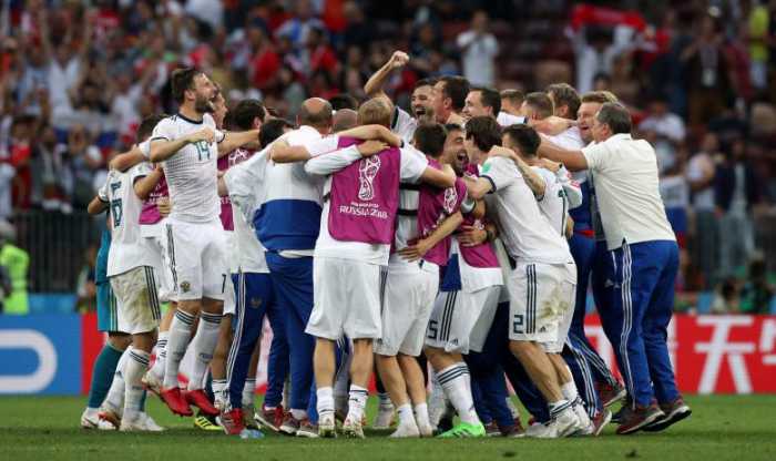 - Russia players celebrate winning the penalty shootout. REUTERS/Carl Recine