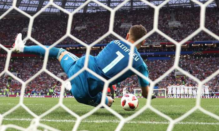 - Russia’s Igor Akinfeev saves Spain’s Koke shot during the penalty shootout. REUTERS/Carl Recine