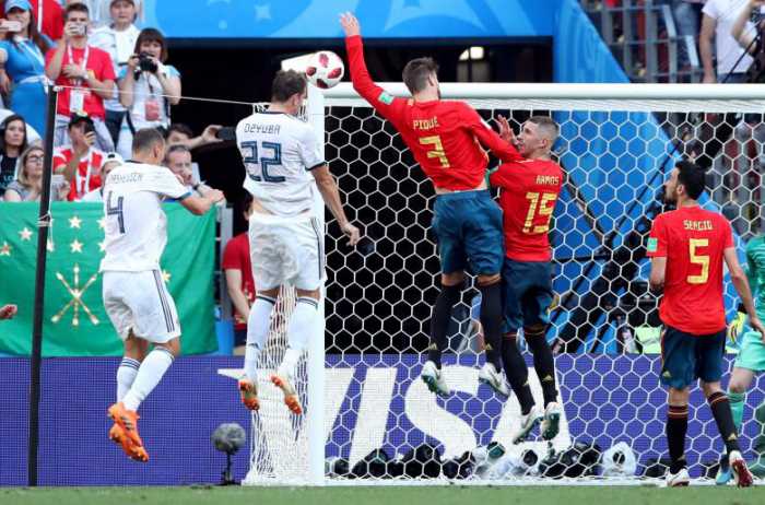 - Spain’s Gerard Pique handles the ball in the area resulting in a penalty being awarded to Russia. REUTERS/Albert Gea